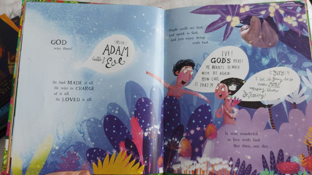 Catalina Echeverri’s detailed illustrations really add to the story. Everything in God’s perfect world (both at the beginning and the end) is bright and bold, while the broken, sinful world, there’s a more muted colour scheme and a grainy overlay. There are some great details, including some of the animals playing hide and seek in the Garden of Eden, while Adam and Eve swim! Don’t miss the pictorial references on the cross to some of humanity’s worst sins, detailed pictures of the first Easter Sunday, and the “Keep Out” Angels cheering when King Jesus welcomes someone to come and live with him!